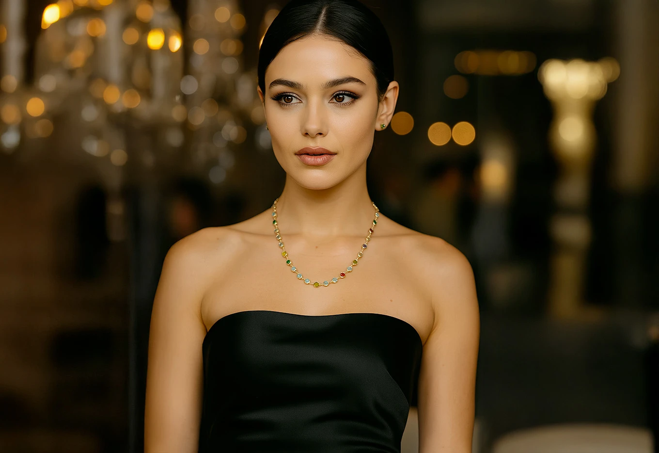Collana Madrid artigianale in pasta di corallo, perle di fiume, ematite dorata e cristalli Swarovski neri, con chiusura a moschettone dorato.