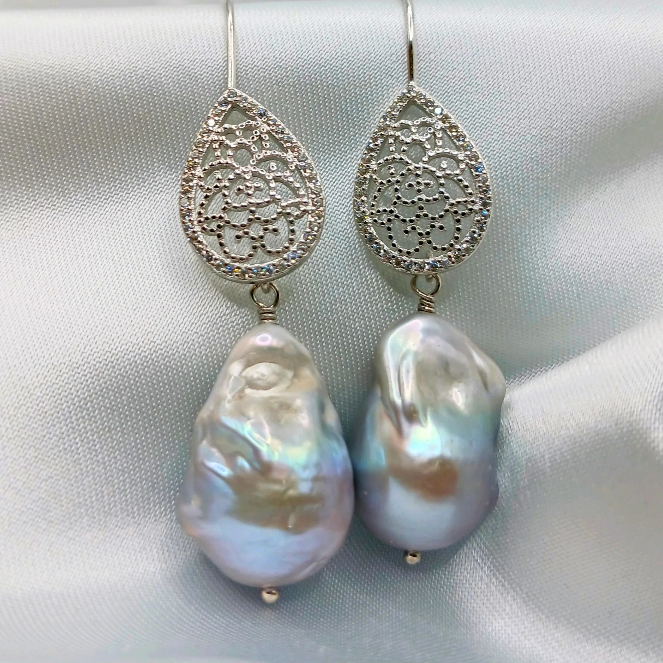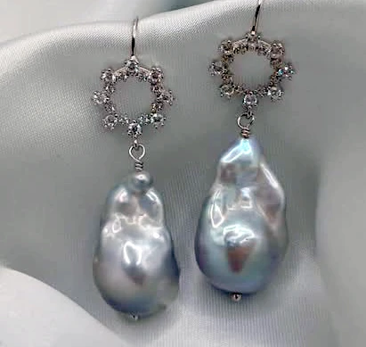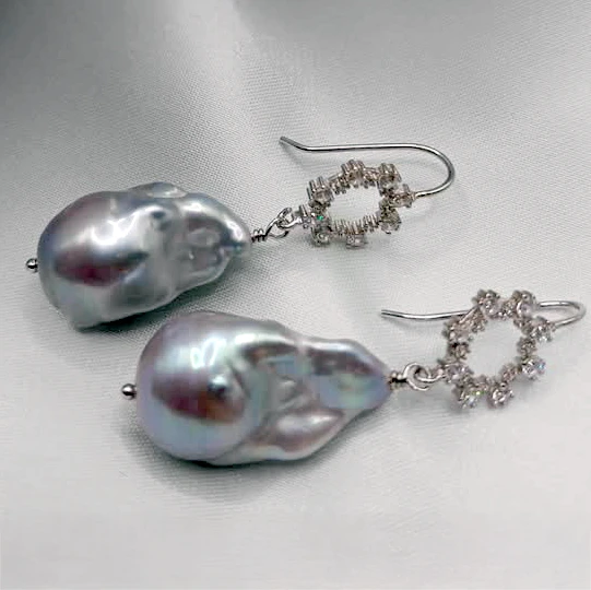 Splendido modello di orecchini con le perle scaramazze bianche o grigie a scelta (22,5 x 16 mm)