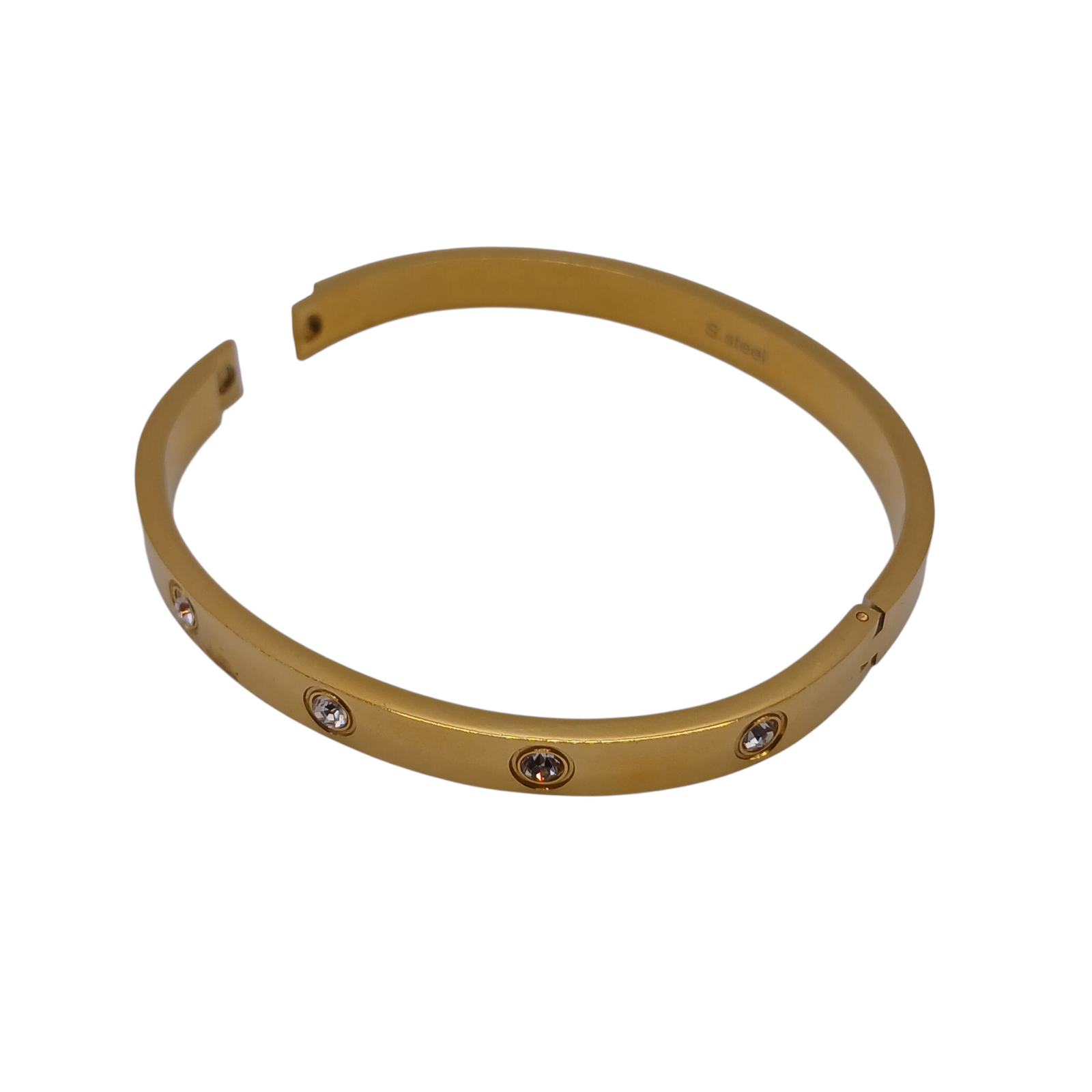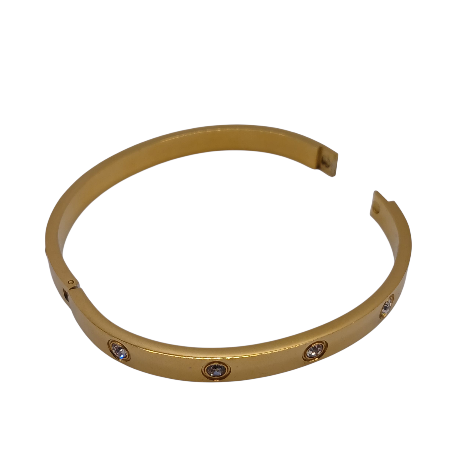 In acciaio inox 316 L dorato, con zirconi bianchi.