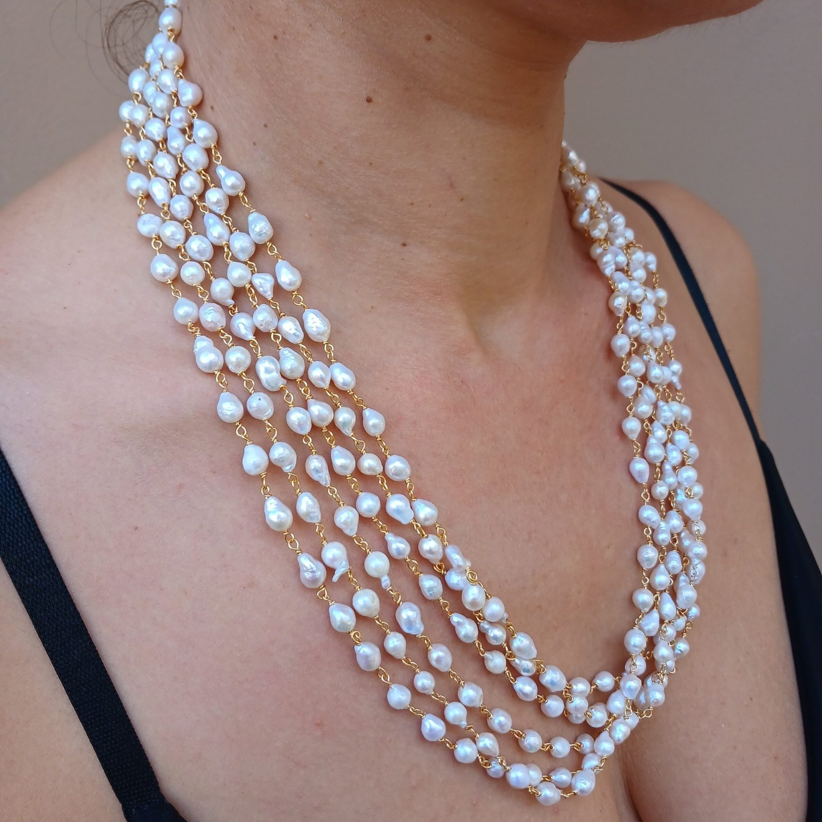 Collana Bella è composta da sei fili di perle scaramazze di dimensioni 7 x 5,5 mm, minuziosamente lavorate a mano con la tecnica del Rosario. Ogni perla è infilata singolarmente con filo d’argento, testimoniando l’attenzione al dettaglio e la dedizione degli artigiani.