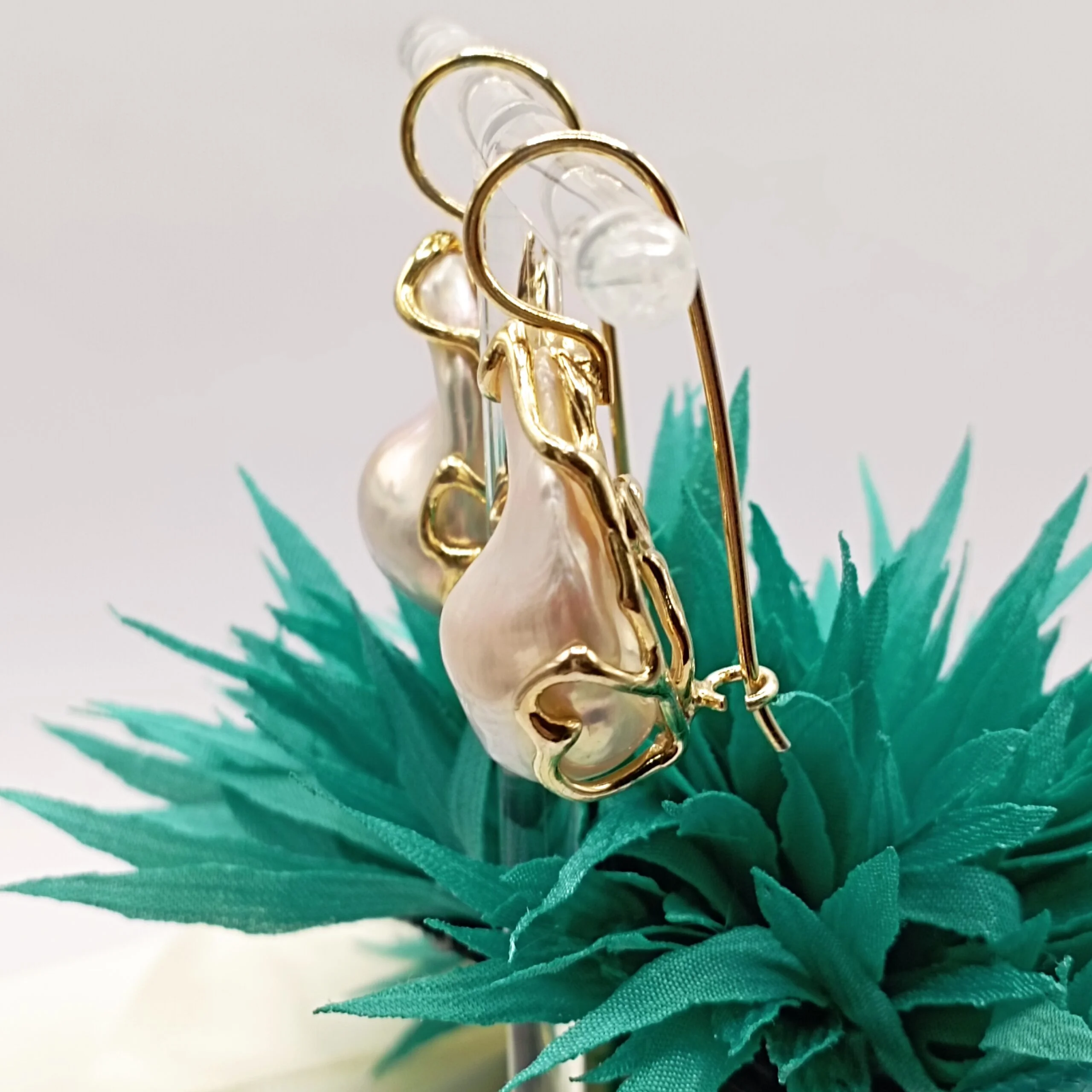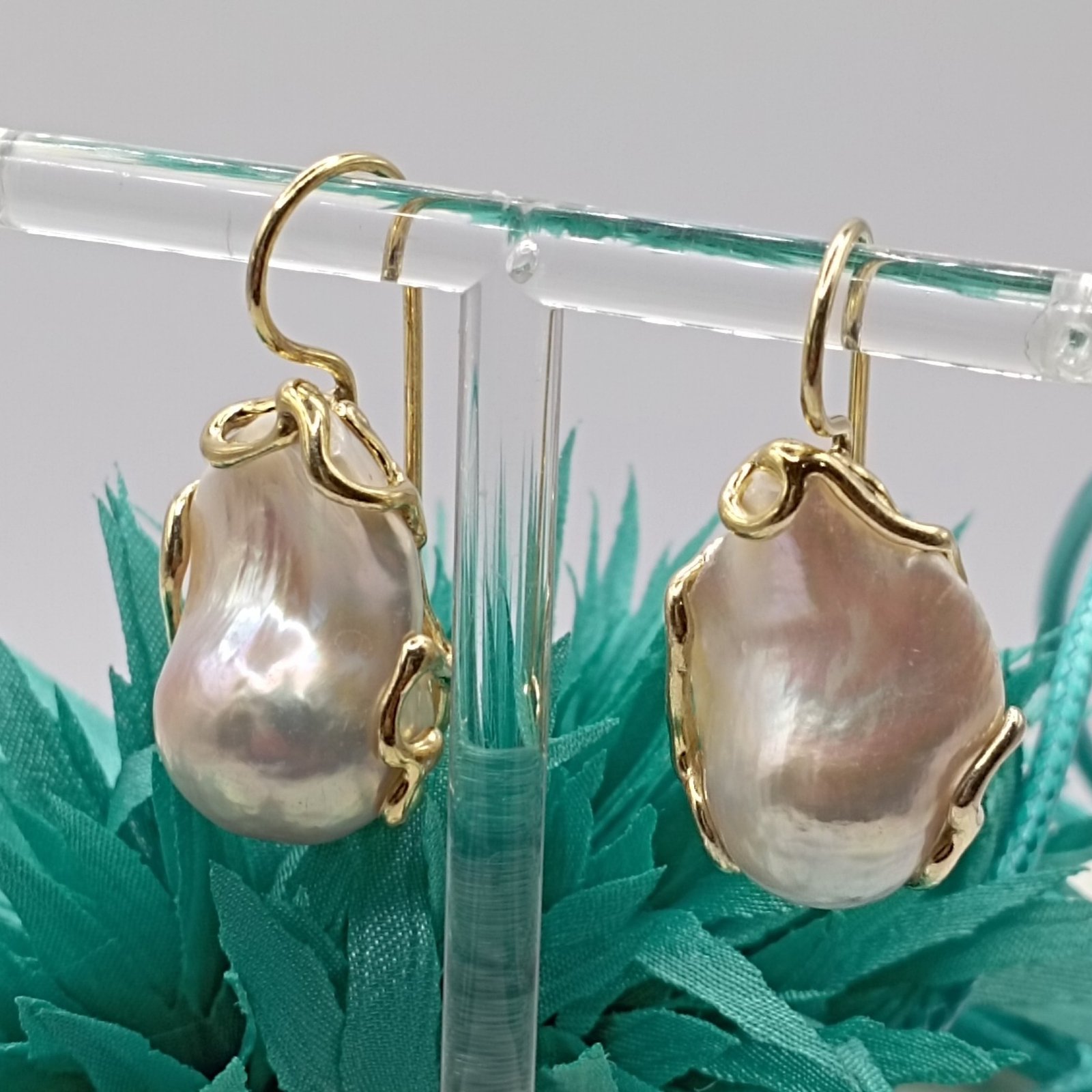 Splendide e vere perle scaramazze grandi di ottima fattura montate artigianalmente su argento 925 bagnato oro 24 Kt. Monachella elegante alla pompeiana.
